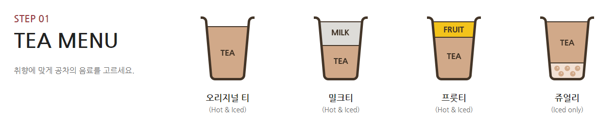 오리지널티, 밀크티, 프룻티, 쥬얼리 4종류가 있습니다.