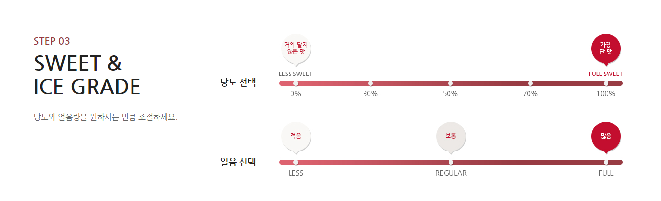 당도는 20% 단위로 0%부터 100% 까지 얼음은 적음, 보통, 많음 3단계로 선택 가능합니다.