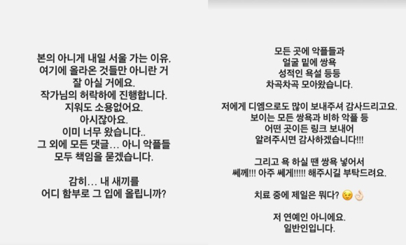 그녀는 덧붙여서 "정말 많은 곳에서 악플과 욕설, 성적인 언어 등을 차곡차곡 모아 왔습니다. 하지만 저는 연예인이 아닌 일반 사람입니다. 이젠 도저히 참을 수가 없습니다"라고 말했습니다.