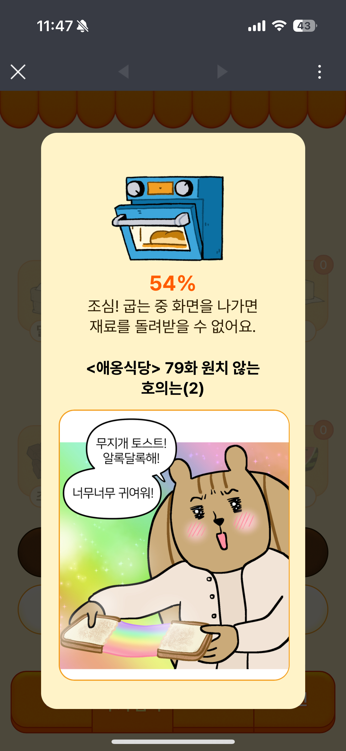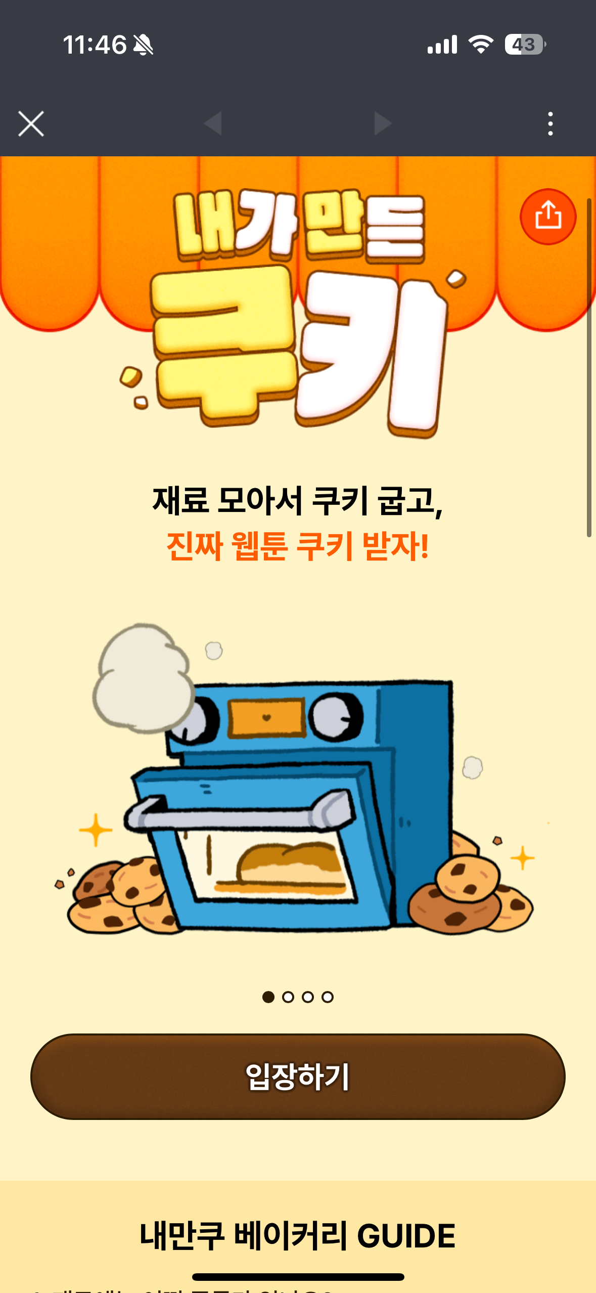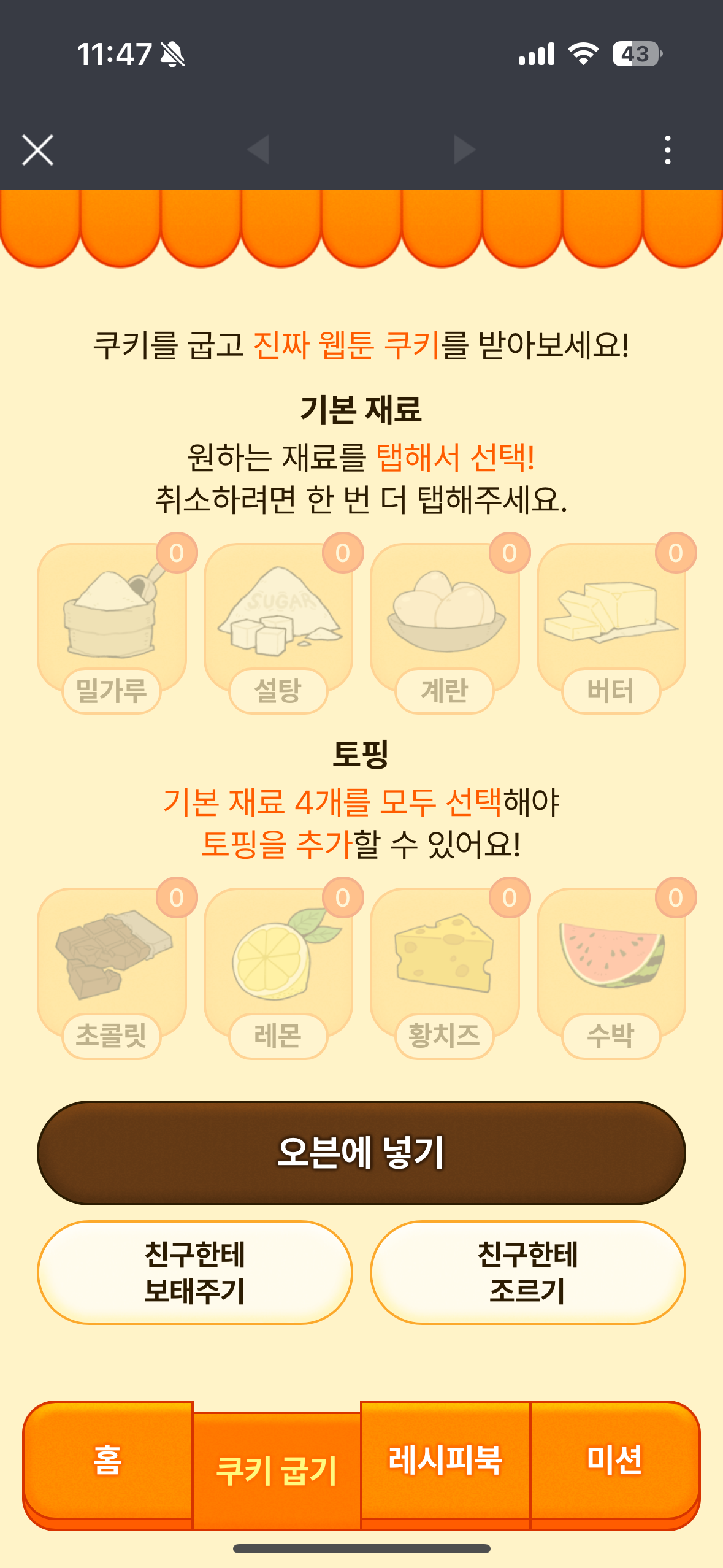 2) 내가만든쿠키 화면이 나오면 설명에 따라 쿠키를 굽고 쿠키가 완성되면 진짜 웹툰 쿠키를 보상으로 받을 수 있습니다.