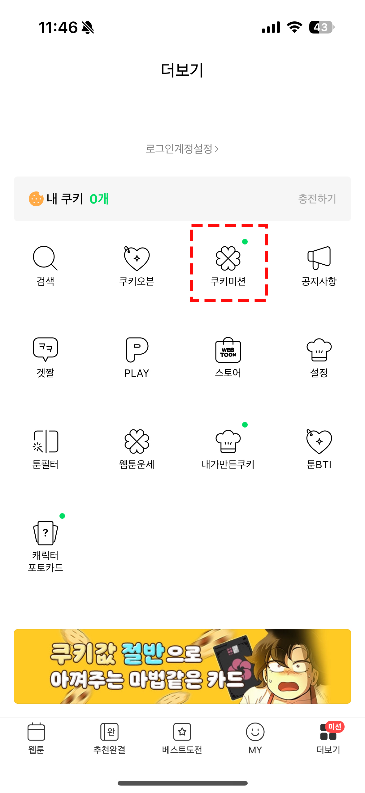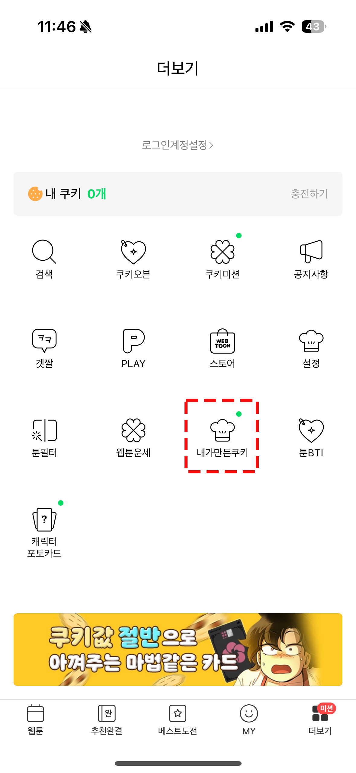 1) 네이버 웹툰 어플을 실행 후 더 보기 클릭 -> 내가 만든 쿠키 탭을 클릭합니다.