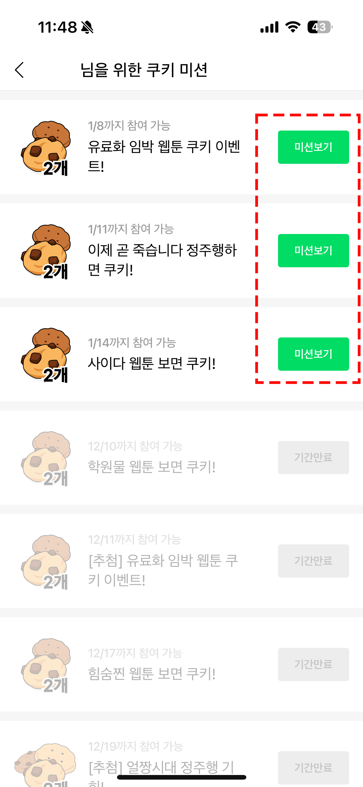 2) 현재 진행하고 있는 쿠키 미션을 확인하고 미션보기를 눌러줍니다.