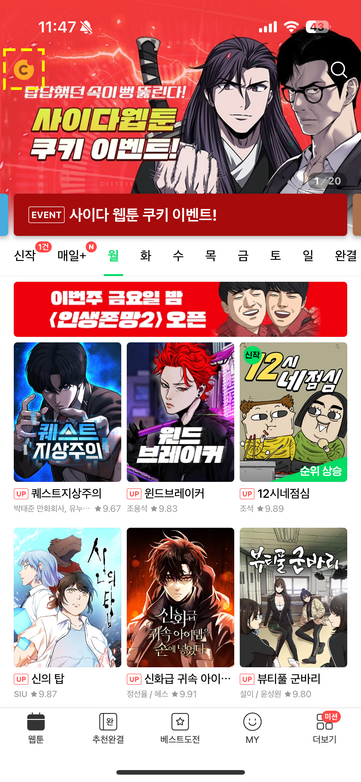 오늘은 네이버 웹툰에서 아직 나오지 않은 회차들을 미리 볼 수 있는 '쿠키'를 무료로 얻는 방법을 알려드리겠습니다!