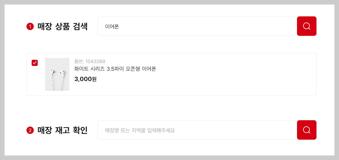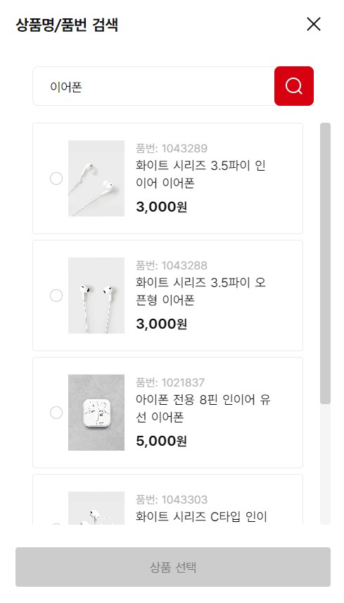 여기에 내가 원하는 상품명이나 품번을 검색하게 되면 상품이 조회됩니다. 예를 들어 '이어폰'으로 검색해 보겠습니다.