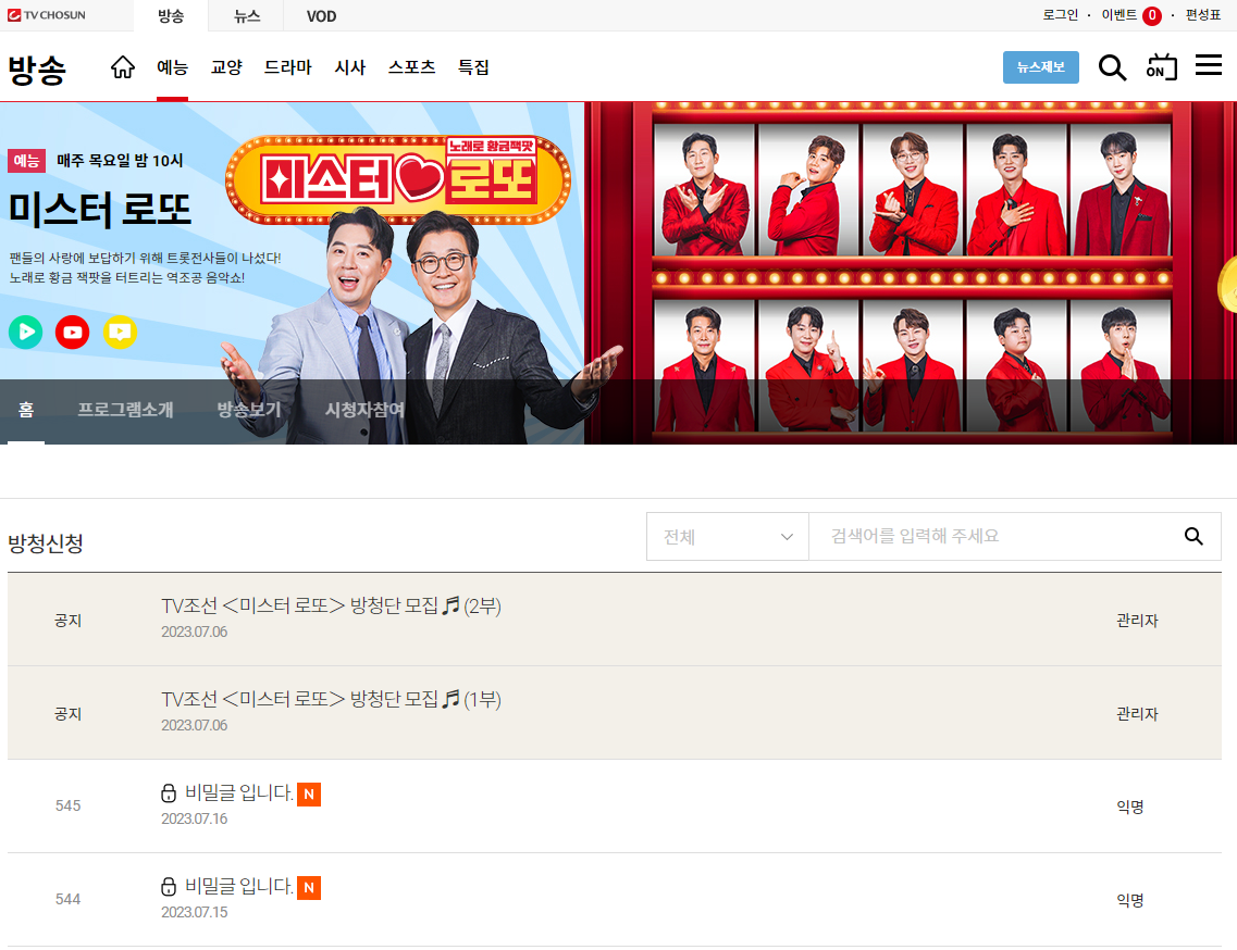 마지막으로 많은 분들이 궁금하셨을법한 미스터로또 방청신청 방법! 미스터로또는 공개방송에 시청자들을 모집하고 있는데요. 미스터로또 방청은 네이버에 미스터트롯 검색 후 홈페이지에 접속해 시청자참여 게시판에 방청단 신청을 하시면 됩니다!