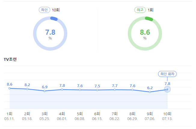 요즘 핫한 인기를 끌고 있는 만큼 시청률 역시 7-8%대를 유지하고 있는데요! 평일 밤늦게 방영하는 것 치고는 시청률이 잘 나오는 것 같습니다. 한가지 아쉬운건 1회가 가장 높은 최고시청률이라는게 조금 아쉽네요!