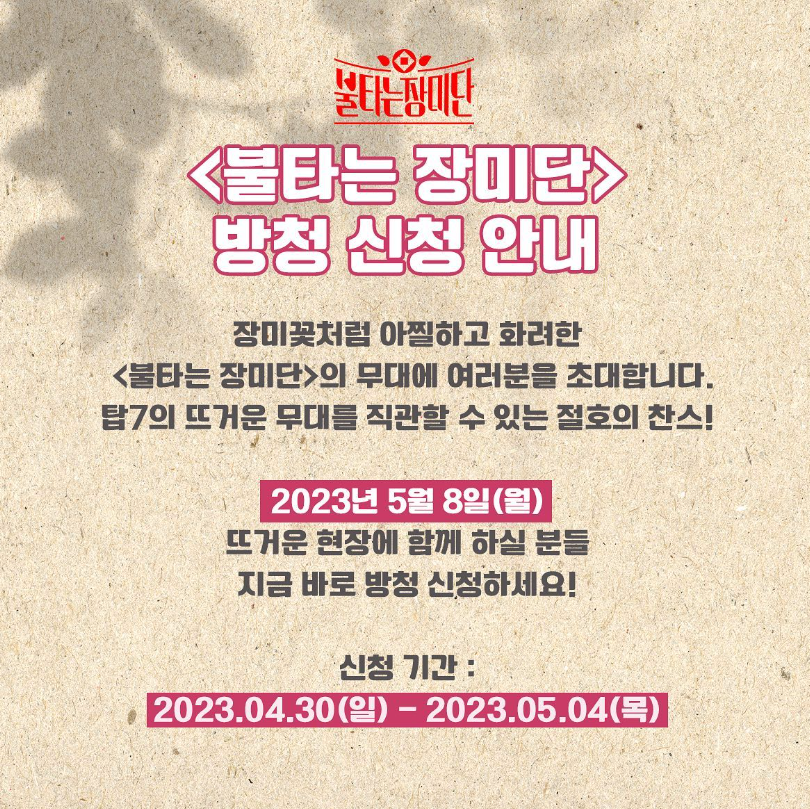 이건 예전에 올라왔던 불타는장미단 방청신청 사진이지만 이렇게 공식 SNS 인스타그램에 방청신청 기간에 공지사항이 올라옵니다.