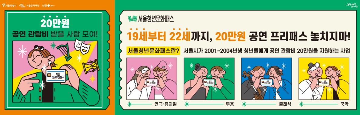 서울청년문화패스의 이름에 맞게 공연 예술분야 관람비용을 지원합니다. 1인당(연간) 20만 원 문화이용권(카드) 지급하고 신한은행 계좌 개설 및 체크카드 발급은 필수입니다.