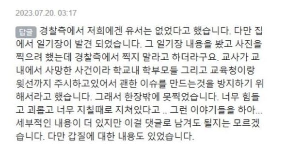 자신을 사망한 교사 사촌오빠라고 주장한 A 씨가 해당 사건 기사에 장문의 댓글을 남겼습니다. 고인의 일기장 내용을 보고 사진을 찍으려 했으나 경찰 측에서 찍지 못하게 말려 한 장만 찍었다는 내용입니다. 그리고 갑질에 대한 내용이 있었다고 합니다.