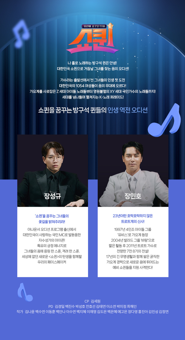 쇼퀸은 X세대 Y세대 Z세대 여성분들의 노래 오디션을 볼 수 있는 오디션 프로그램입니다!