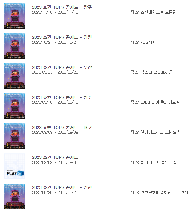 쇼퀸 콘서트는 현재 광주, 창원, 부산, 청주, 대구, 인천, 서울 총 7개의 지역에서 예정에 있습니다.