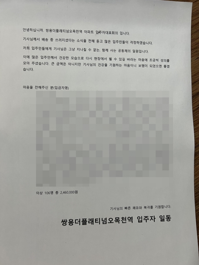 여기서 끝이 아닙니다! 해당 아파트 입주자대표회 측은 해당 택배기사를 위해 수술비 모금을 진행하였고 정말 많은 분들이 따뜻한 손길이 이어졌습니다. 순식간에 248만원이 모였고 총 107세대가 참여해 입주민들의 편지와 함께 전달되었습니다.
