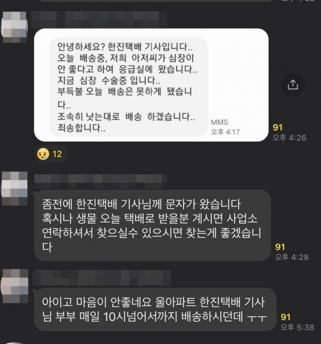 수술로 인해 배송이 늦어진다는 양해문자를 받은 고객들 중 이를 그냥 넘어가지 않는 곳이 있었습니다. 바로 쌍용더플래티넘오목천역 입주민들이었습니다. 해당 메시지를 받은 주민들 중 한 명이 내용을 캡처해 주민들과 공유했고 이를 본 주민들은 부부가 매일 밤 10시 넘어서까지 열심히 하시던 모습이 생각나던데 안타깝다는 반응이 이어졌습니다.