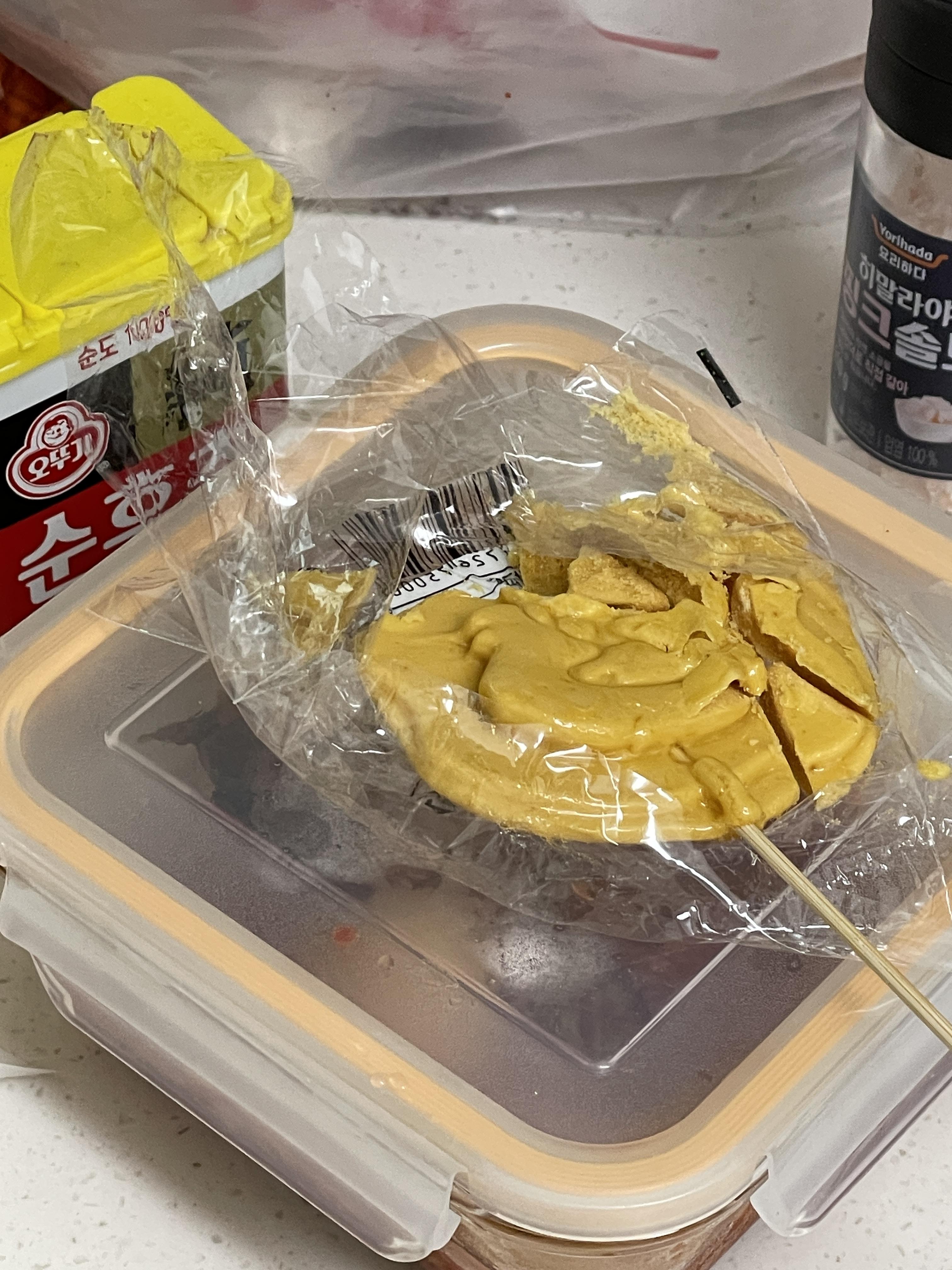 그래서 배달시켜 먹고 리뷰 이벤트로 받았던 달고나가 눈에 보이길래 달고나를 좀 부셔서 넣어줬어요.