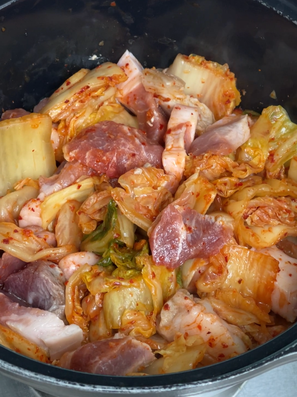 1. 냄비에 식용유를 두르고 김치와 돼지고기를 넣어 볶아줍니다.