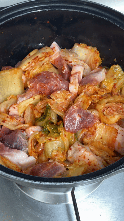 고기에 김치 양념이 잘 밸 수 있도록 잘 섞어주시면 됩니다. 계속 휘젓다 보면 아래 움짤처럼 고기도 어느 정도 익을 거예요!
