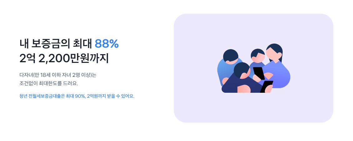 또한 토스뱅크는 다자녀 특례 대출을 통해 고객의 선택권을 높였습니다. 미성년 자녀 수가 2명 이상인 고객을 대상으로, 임차보증금의 88% 한도로 최대 2억 2200만 원까지 대출이 이뤄집니다. 청년의 경우 만 34세 이하의 청년이면서 동시에 무주택자가 대상입니다. 임차보증금의 90% 한도로, 최대 2억 원의 대출이 이뤄집니다.