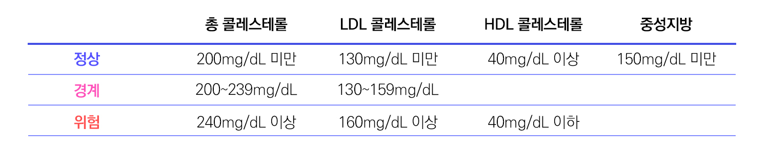 정상수치는 총 콜레스테롤이 200mg/dL 미만에 LDL 콜레스테롤 130mg/dL 미만, HDL 콜레스테롤 40mg/dL 이상, 중성지방 150mg/dL 미만이 여야 해요.