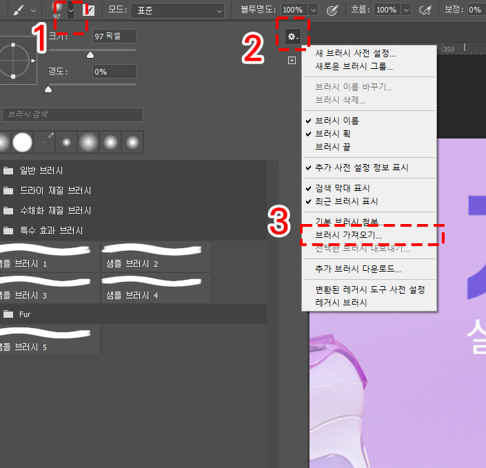 브러쉬 (B) -> 톱니바퀴 버튼 클릭 -> 브러쉬 가져오기