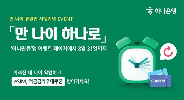 '하나원큐'앱 이벤트 페이지에서 8월 31일까지! "만 나이 하나로"