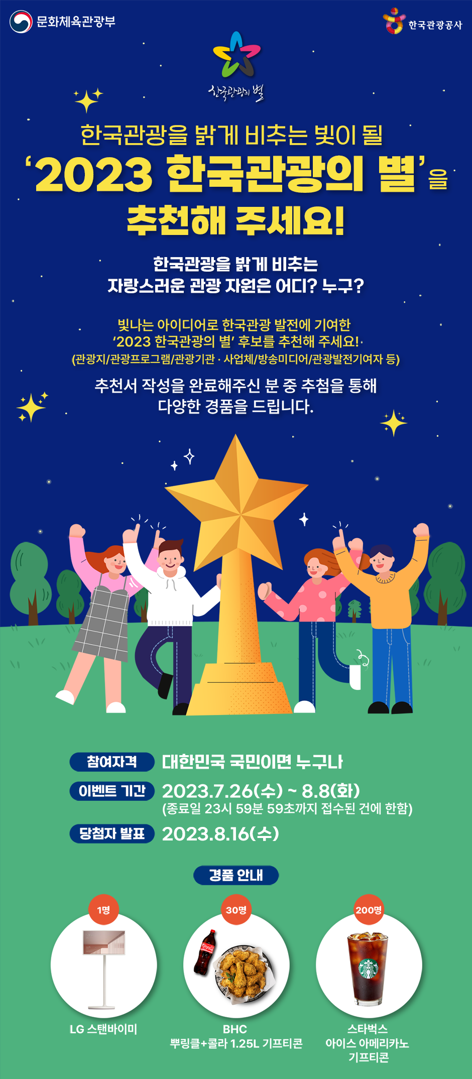 이번 2023년 7월 26일부터 8월 8일까지 문화체육관광부와 한국관광공사가 주관하는 '2023 한국관광의 별' 이벤트를 진행합니다. 이 이벤트는 현재 13회째로 2010년에 시작되어 지금 까지 진행되고 있는 이벤트입니다. 국내여행, 한국 관광의 관심을 높이려 진행되는 이벤트입니다.