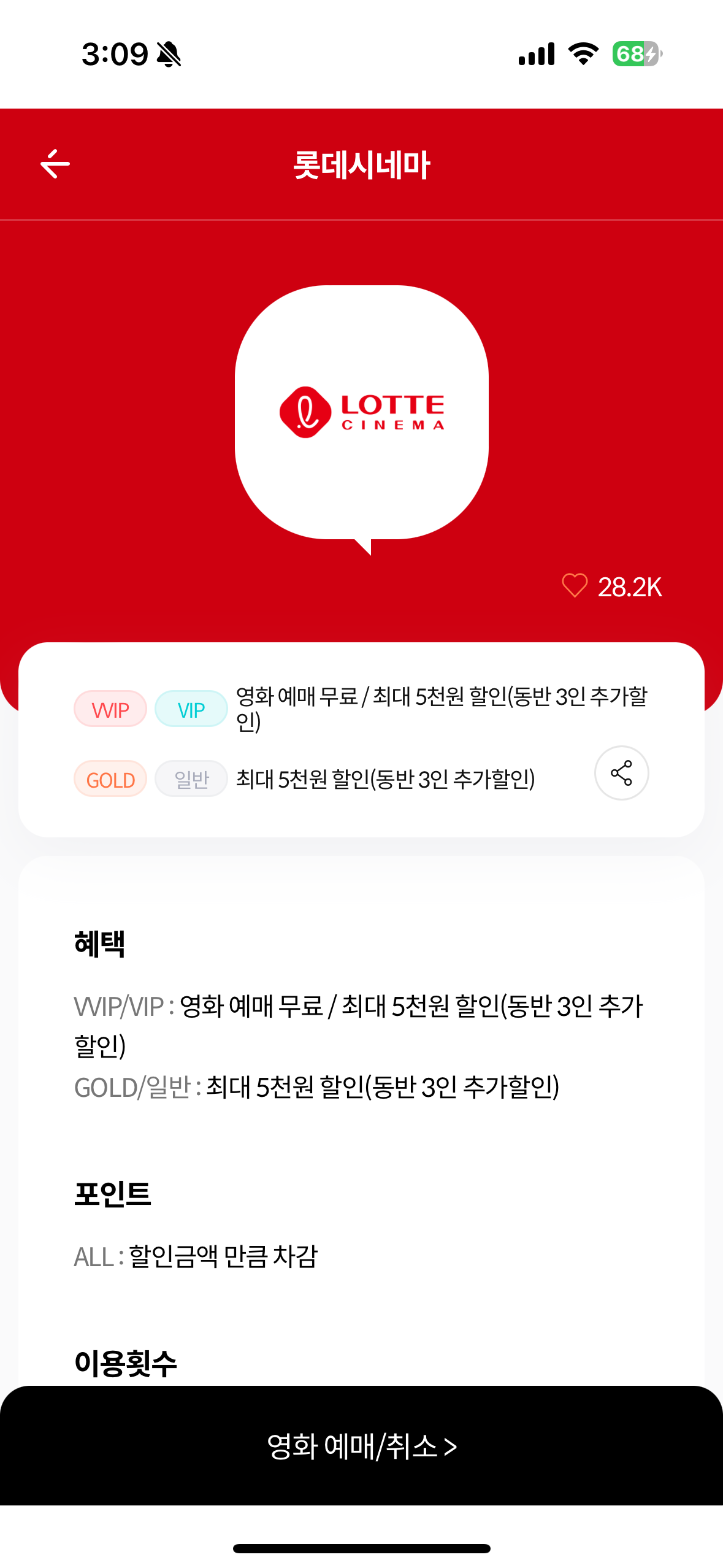 혜택 : 롯데시네마 현장 매점 콤보 1,500원 할인