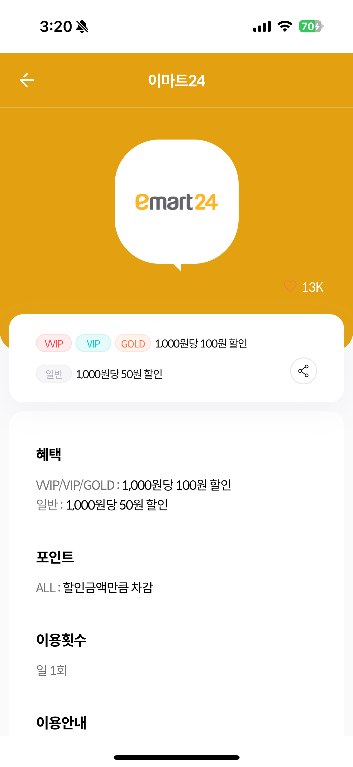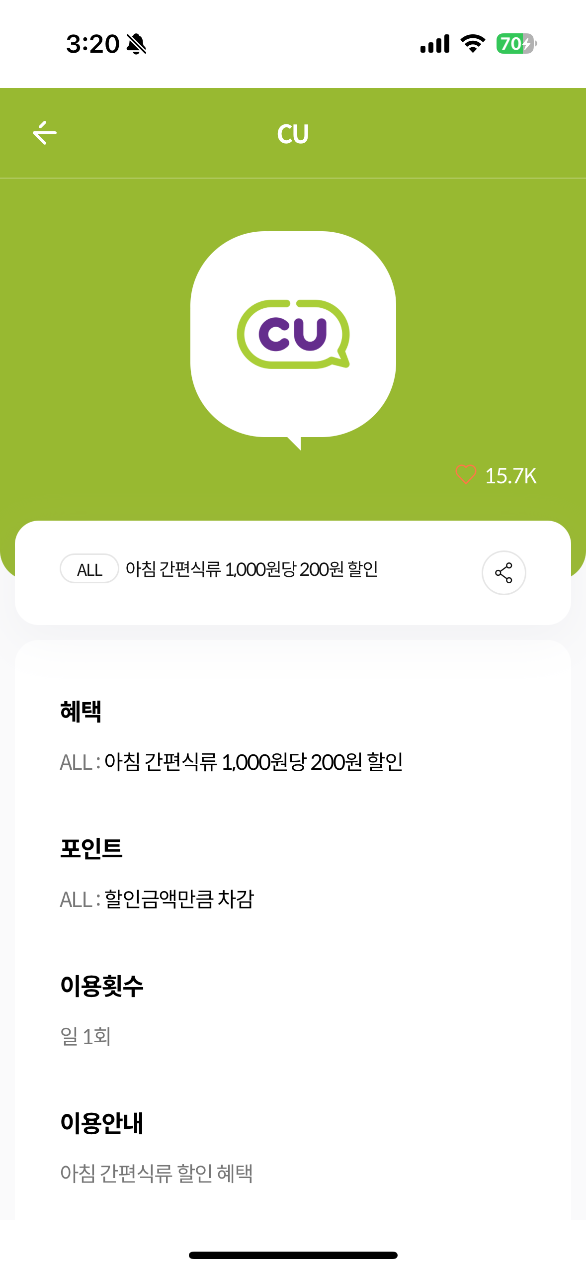 특히나 편의점 할인 같은 경우 월 1회가 아닌 일 1회로 매일매일 사용할 수 있는 혜택이기 때문에
